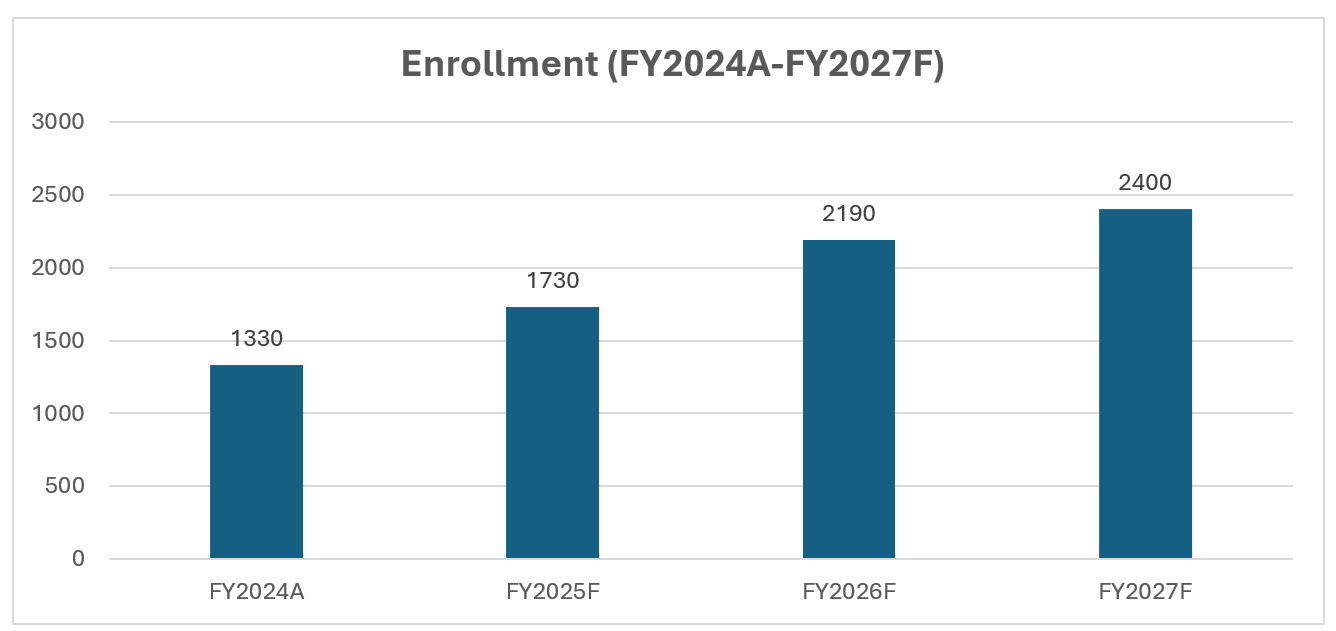 - Cohort Layering: Total enrollment grows from 1,330 (FY2024A) to 2,400 (FY2027F)